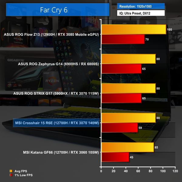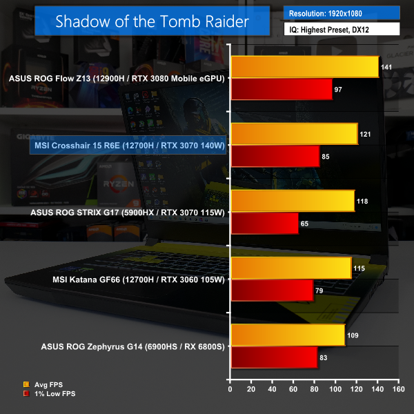 Far Cry 6 is far more CPU-biased, though, and struggles to outperform on the Crosshair 15 R6E and its 12700H versus the Ryzen competitors with slower GPUs. Normal order is resumed in Shadow of the Tomb Raider, with the 12700H and RTX 3070 140W combining for an average FPS above 120. And Watch Dogs Legion results in another second-place finish for the Crosshair 15 R6E, with only the Core i9 and high-power RTX 3080 eGPU ASUS solution being quicker.