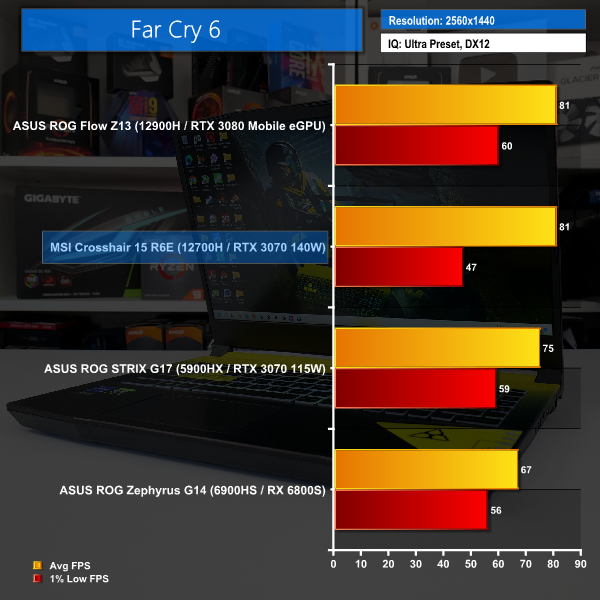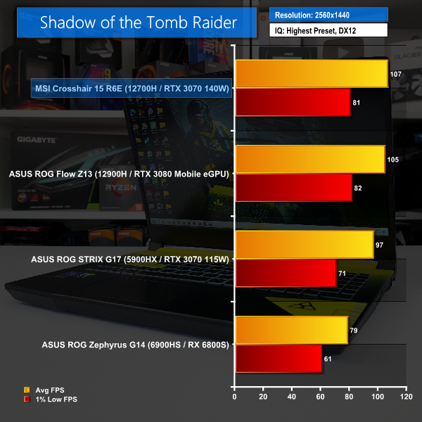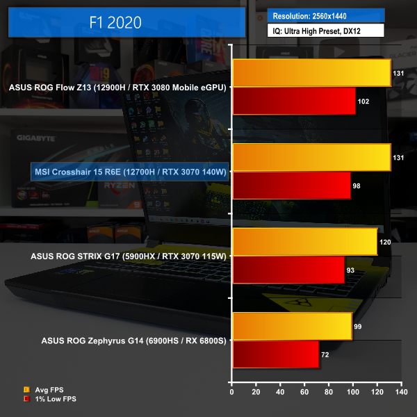 MSI’s Crosshair 15 R6E does very well in our 1440p gaming test and scores higher than we anticipated even versus the ASUS RTX 3080 solution – albeit an eGPU solution.