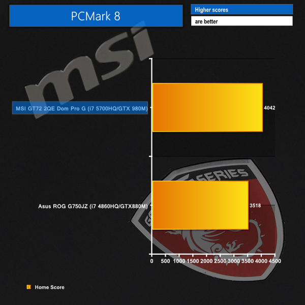 The fast combination of a Broadwell i7 CPU and GTX 980M GPU result in impressive performance levels in Futuremark's 3DMark and PCMark 8 tests.