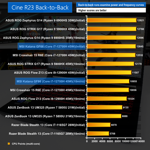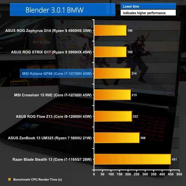 Intel’s Core i7-12700H in the MSI Katana GF66 does well to hang with the Ryzen competitors in the short Cinebench rendering test. But the longer duration Blender runs nullify Intel’s initial – massive – power surges and swing the pendulum in favour of MSI’s Ryzen-equipped competitors.