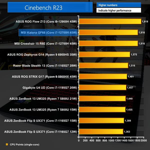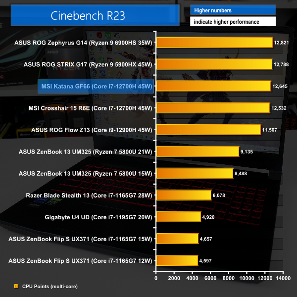 Single-threaded performance is where the Katana GF66 is very strong. That’s thanks to the lofty 4.7GHz rated boost clock of the Core i7-12700H, coupled with its superb architecture.