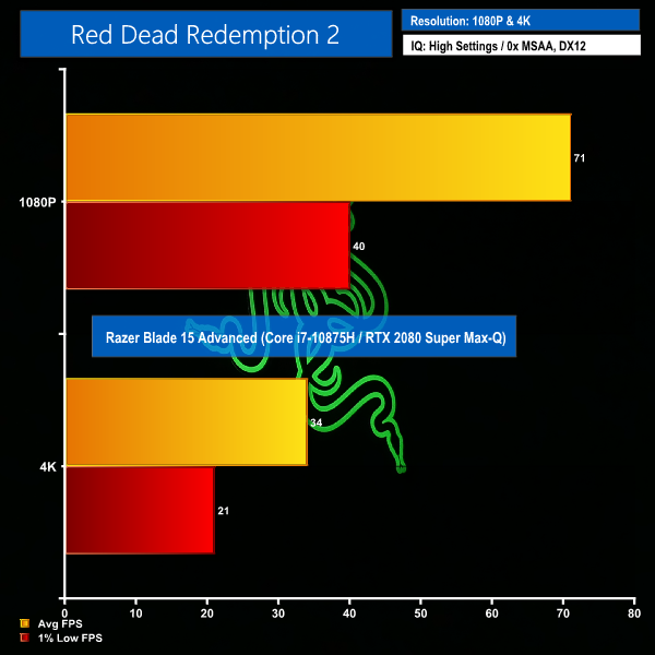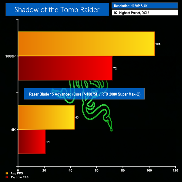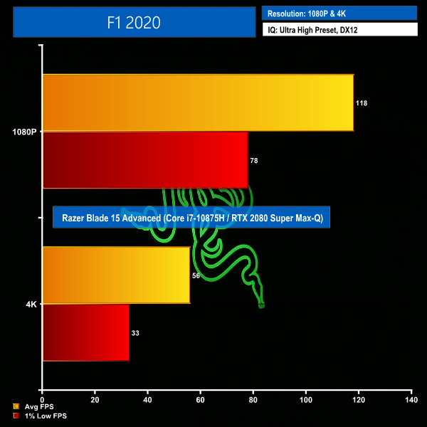 1080P gaming is comfortable with the under-the-hood hardware. However, 4K gaming on the native UHD screen proves too much stress in demanding AAA titles. Low image quality settings at 4K or decreasing the resolution to 1440P is likely a better compromise if outputting to an external monitor, but Nvidia DLSS is also an option if the game supports it.