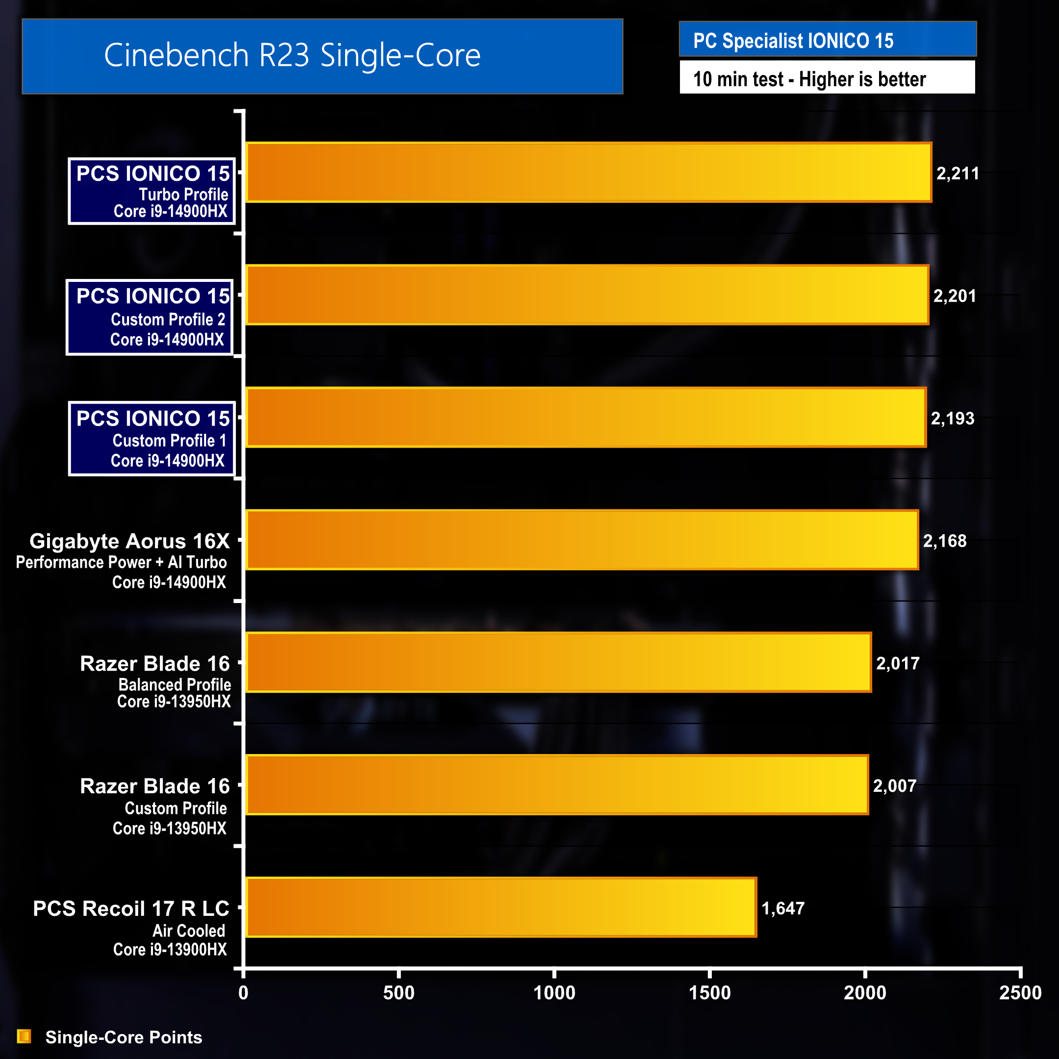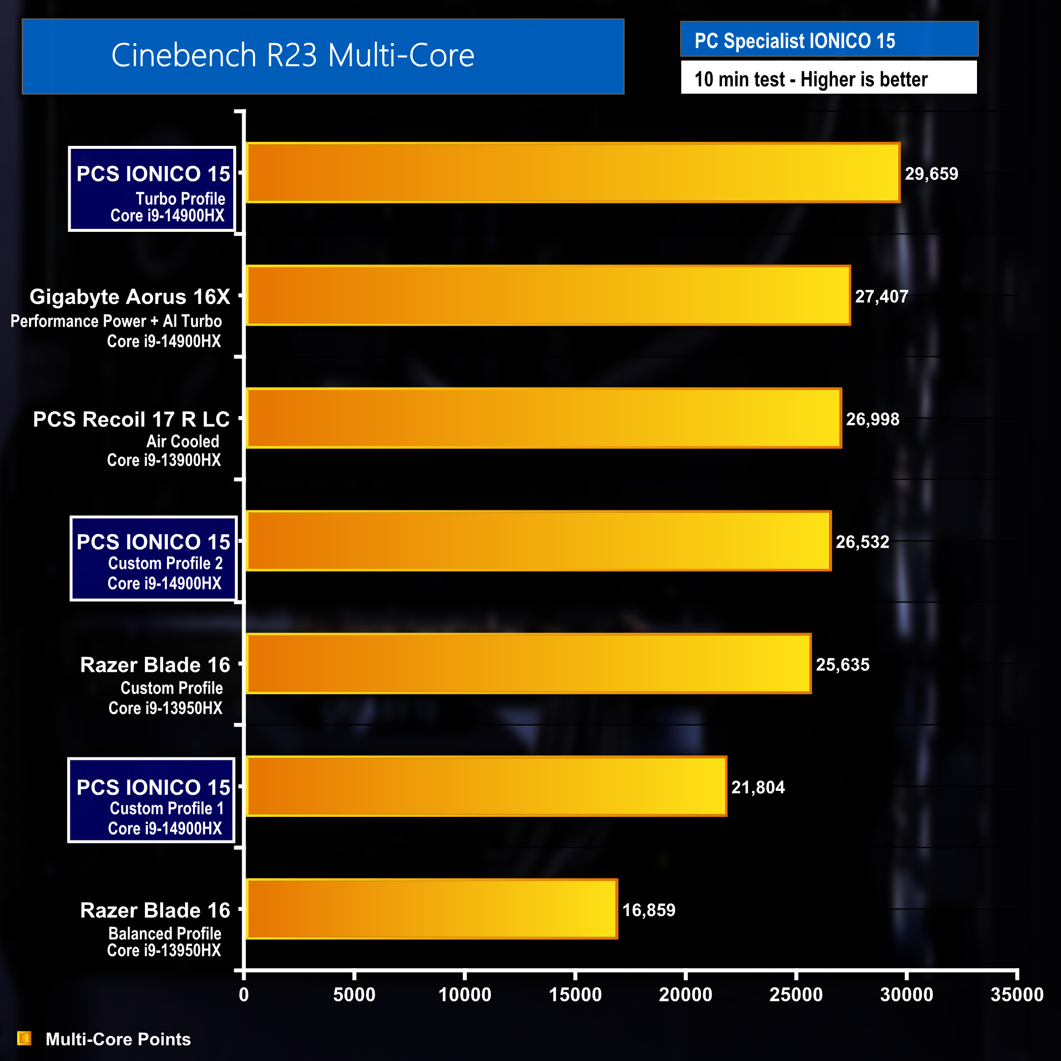 We ran the IONICO laptop through our full set of benchmarks – three times in total. This was due to using three different power profile which applied differing PL1 and PL2 power limits to the CPU. The Cinebench R23 multi-core benchmark result shown above highlights that the increased power provided to the processor with the laptop using its ‘Turbo Profile' resulted in a significantly improved score of 29,659 points when compared to the result of 21,804 points when using the out of the box ‘Custom Profile 1'.