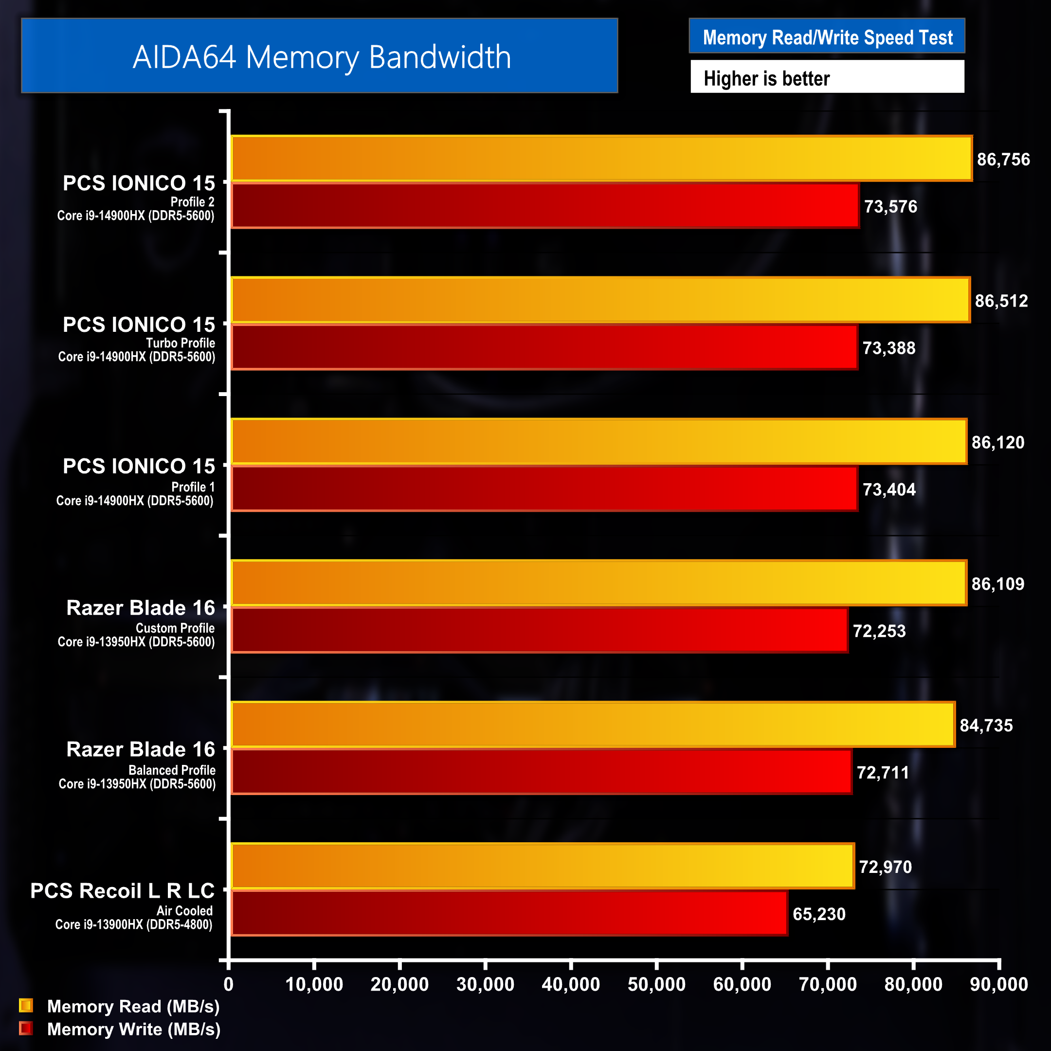 Running the system memory through a benchmark test with AIDA64 resulted in roughly the same read and write speeds regardless of which profile was active on the laptop. Custom Profile 2 came out on top with read speeds of 86,756MB/s and write speeds of 73,576MB/s.