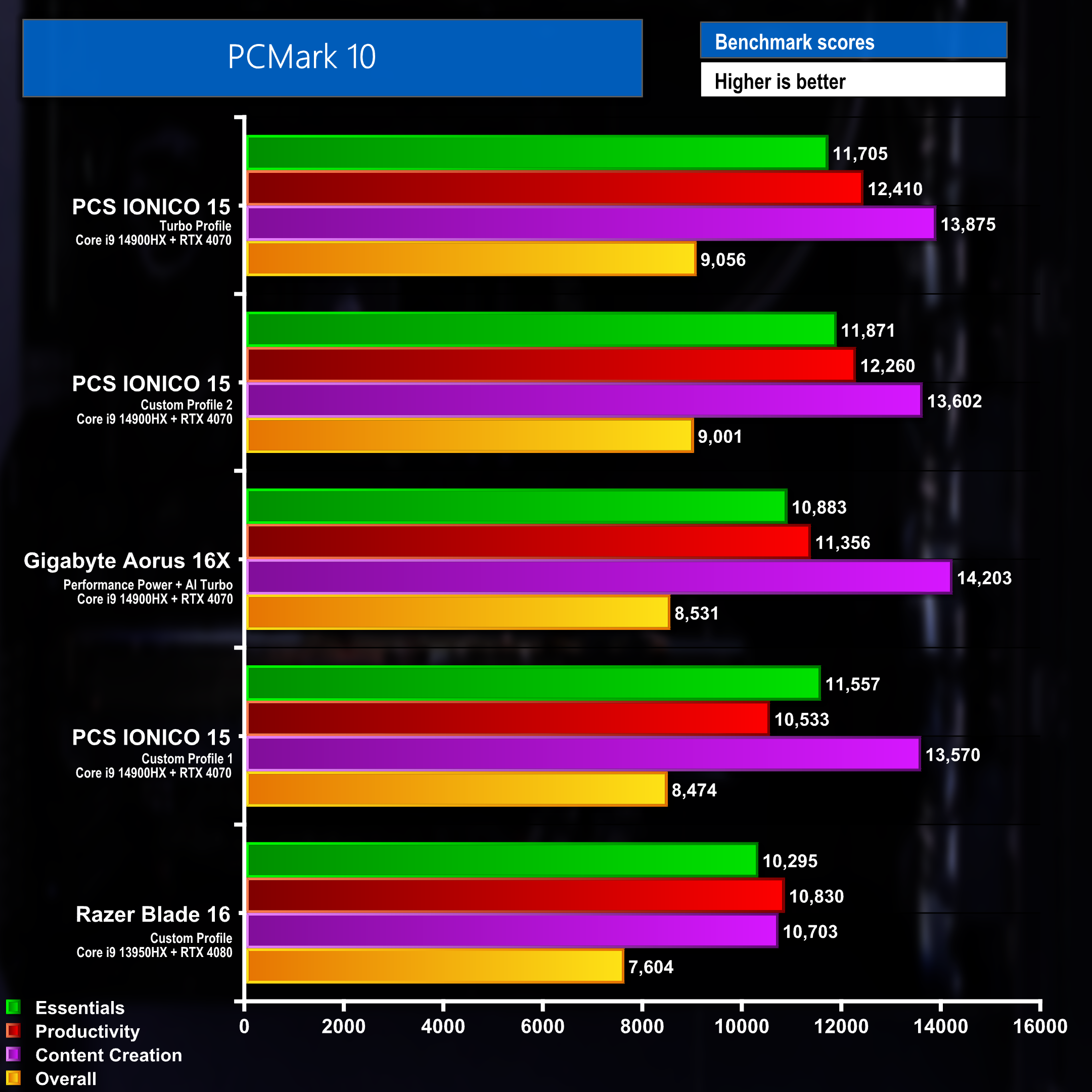 Rounding out the synthetic benchmarks tests with PC Mark 10 results again shows that the IONICO performs better when running with the ‘Turbo Profile' active, however the laptop fell slightly short of the results achieved by the Gigabyte machine in the content creation category.