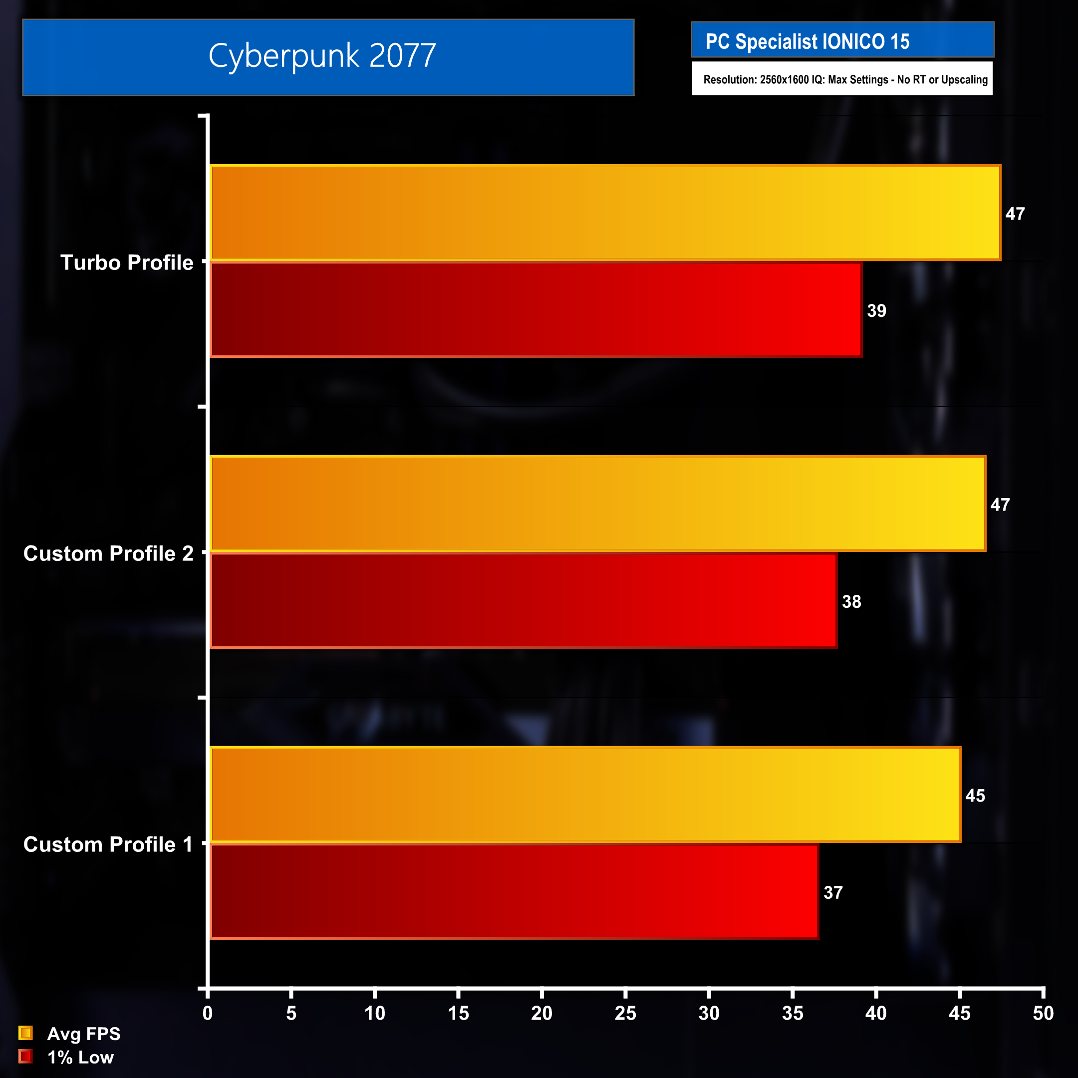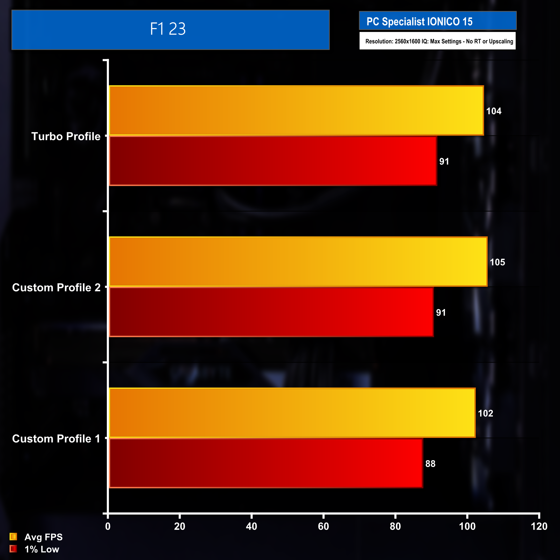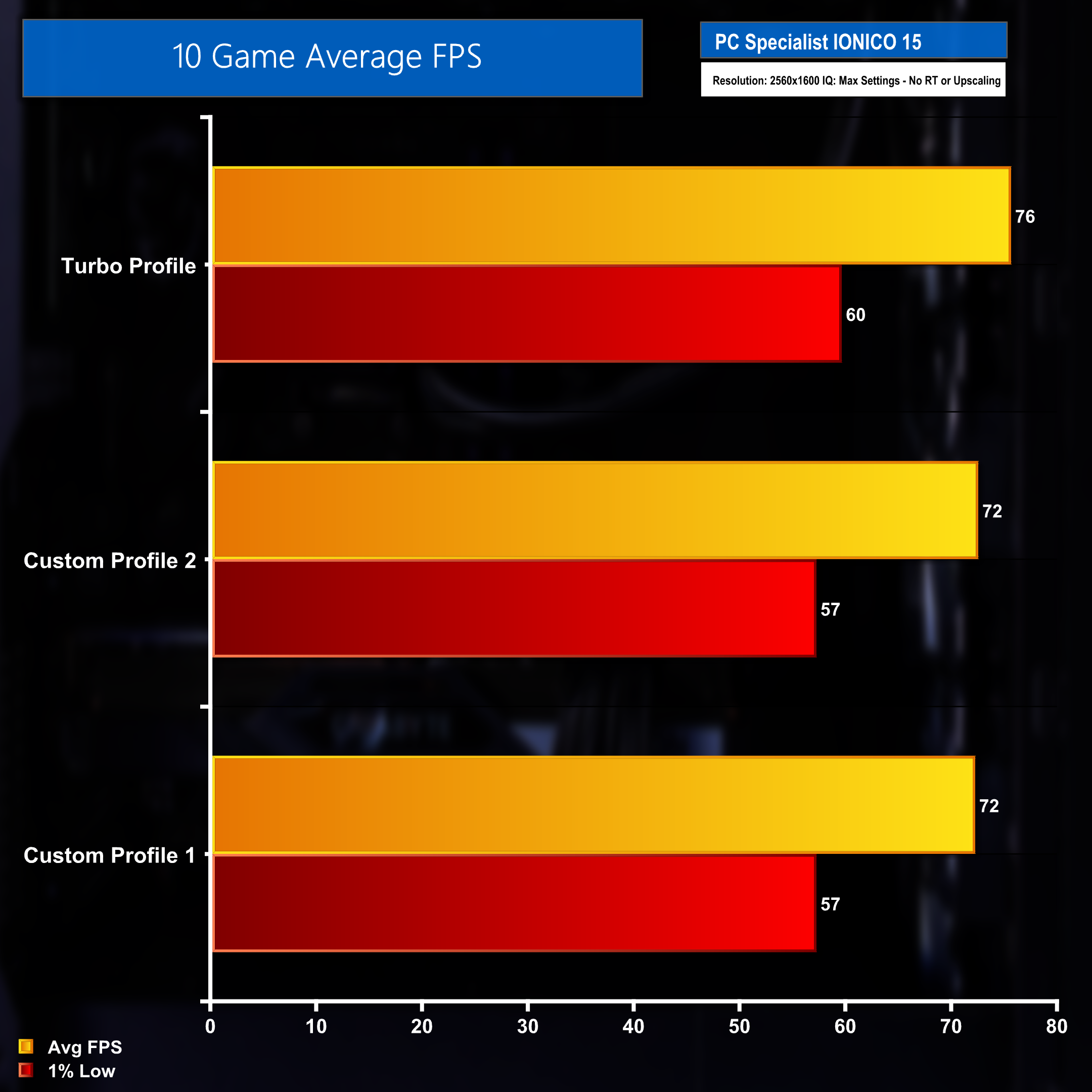 Gaming on the IONICO 15 laptop was only very marginally affected by selecting an increased performance profile. 1% low and average FPS figures did increase in most of the titles we test but not by any substantial amount and would not be noticeable by most gamers using this laptop day to day.