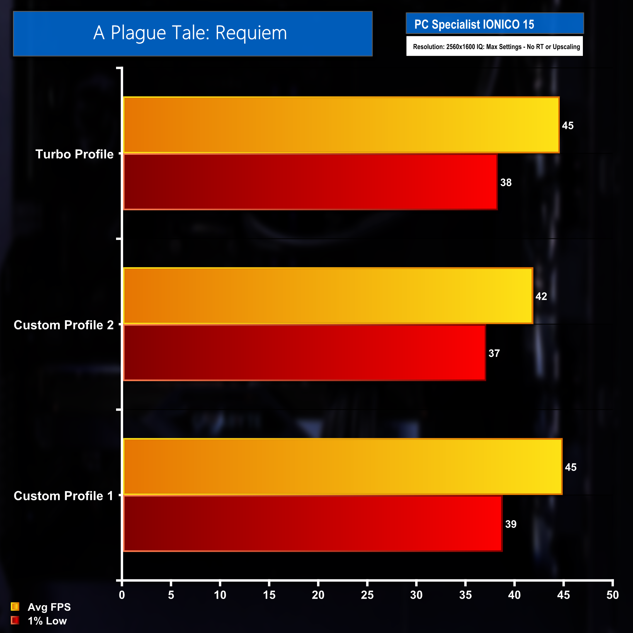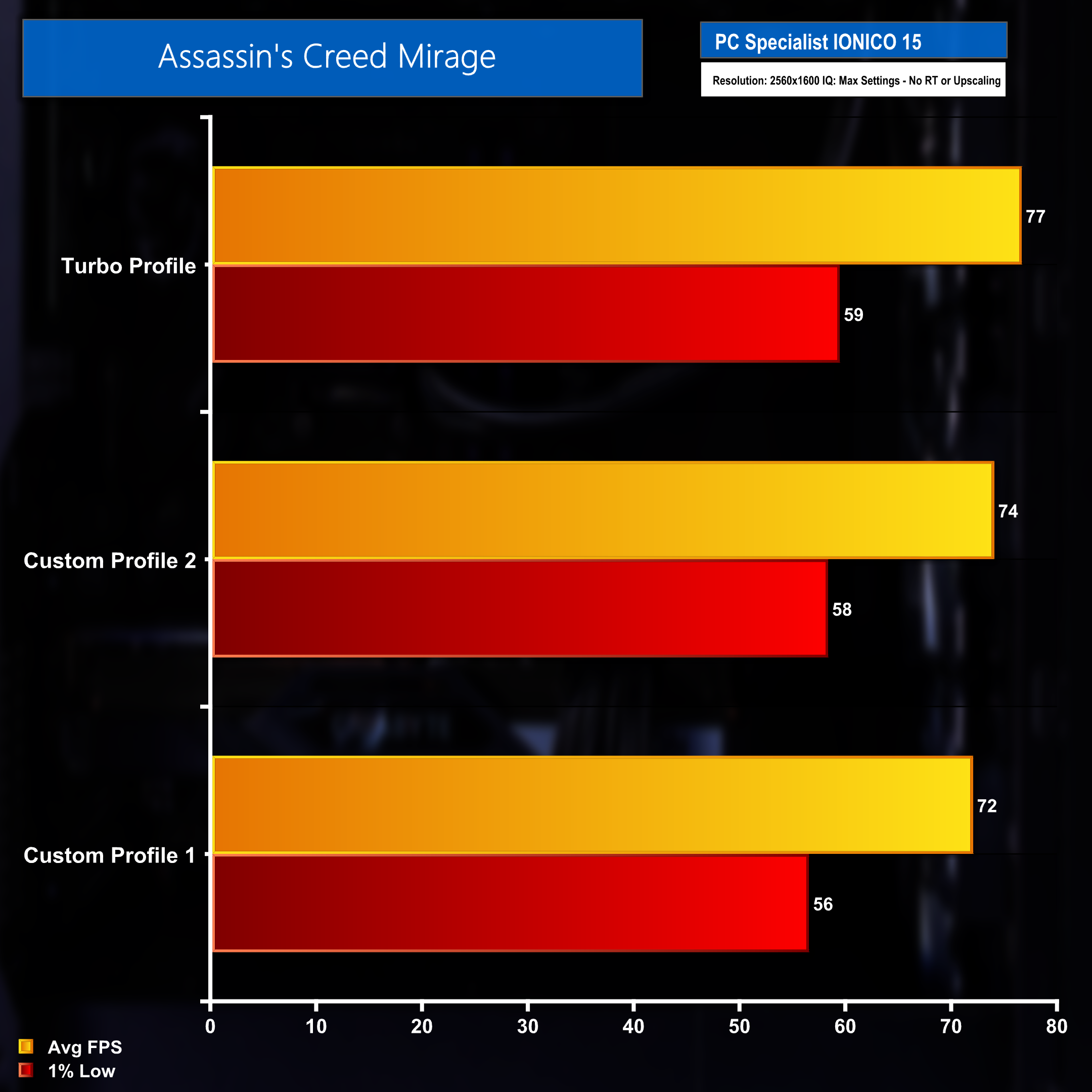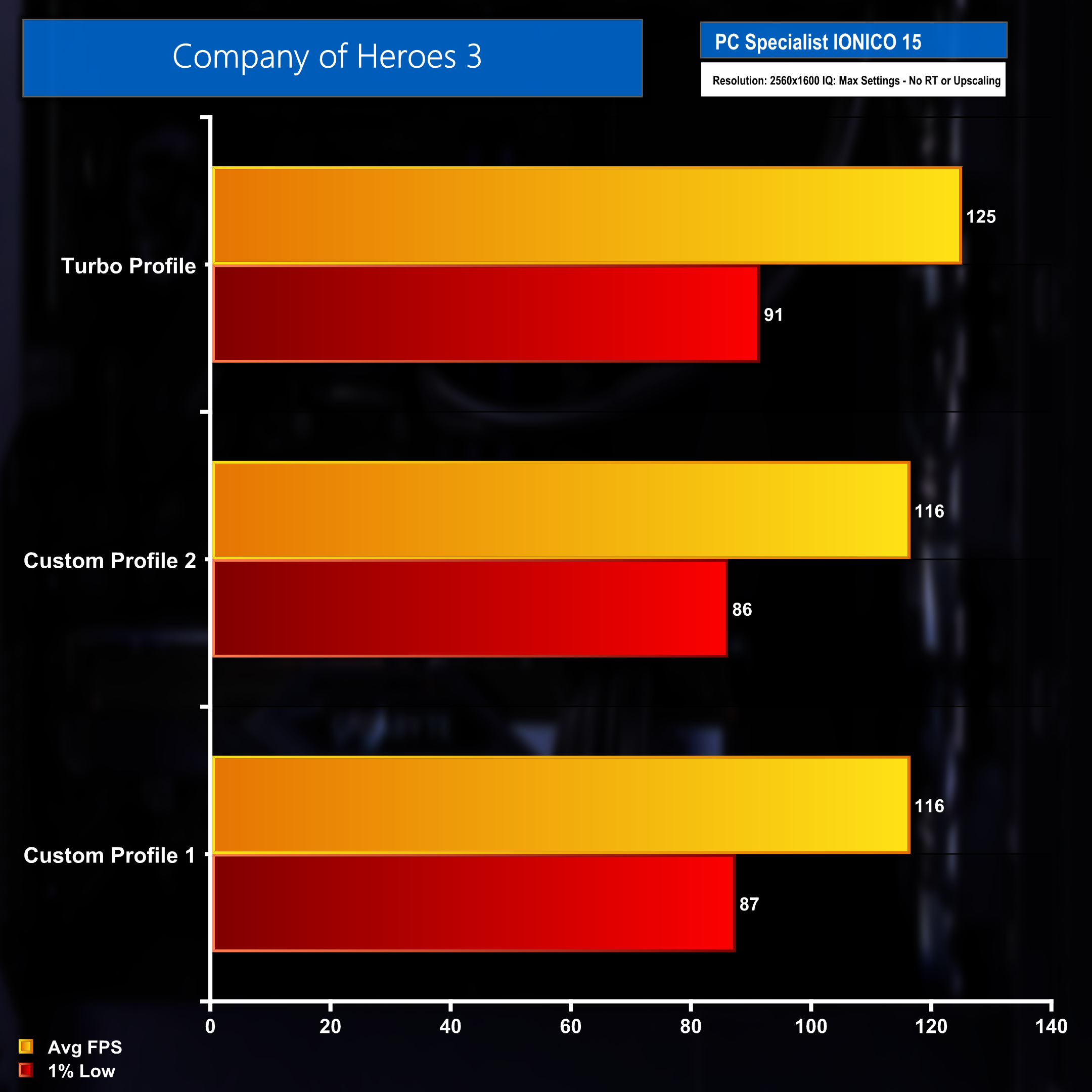 Gaming on the IONICO 15 laptop was only very marginally affected by selecting an increased performance profile. 1% low and average FPS figures did increase in most of the titles we test but not by any substantial amount and would not be noticeable by most gamers using this laptop day to day.