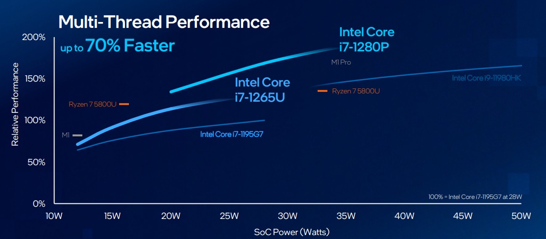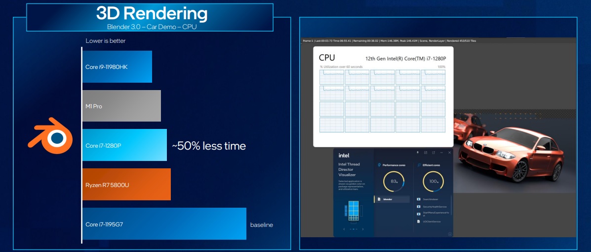 According to Intel, we'll see up to 70% faster performance with the new P-series processors. Compared to an 11th Gen Core i7, a Core i7-1280P can render the Blender 3.0 Car Demo in 50% less time, and we can also see performance gains in other professional and productivity apps.