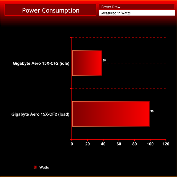 Gigabyte makes big claims about this laptop’s 94Wh power pack and its battery life. We ran the PC Mark 8 work battery test and saw a result of five hours and 40 minutes, which is certainly decent. When idle, this laptop sits at around 38 watts of power usage but while gaming, this is kicked up to 99 watts.