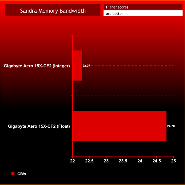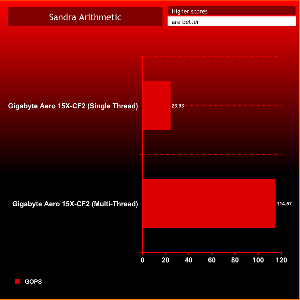 The Gigabyte’s first benchmark results indicate its high-end abilities. The Aero’s single-threaded arithmetic score is good, and its multi-threaded result is just over four times as rapid – no surprise considering that this is a quad-core processor with Hyper-Threading.