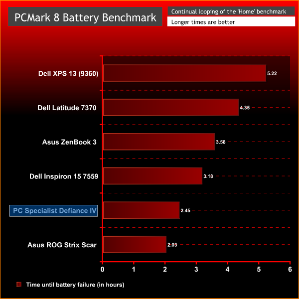 If you’re gaming, expect a little more than an hour from the PC Specialist – so make sure you’re not far from a plug socket.