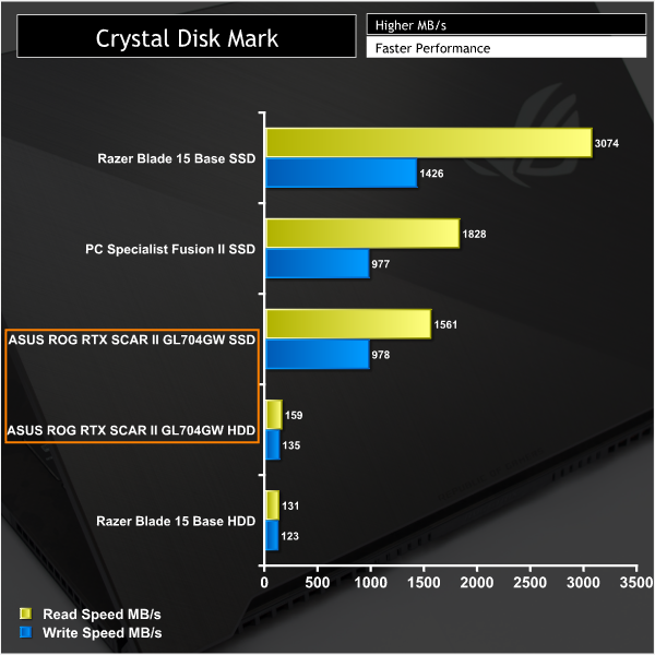 The NVMe drive that ASUS uses in the ROG Strix RTX SCAR II GL704GW (Intel 660P Series 512GB NVMe) is fairly entry-level in terms of performance for an NVMe SSD with about 1.5GB/s read and 1GB/s write. The Razer Blade 15, for example, uses the higher-end Samsung PM981 NVMe drive which has almost double the read performance and about 50 per cent more writing speed.