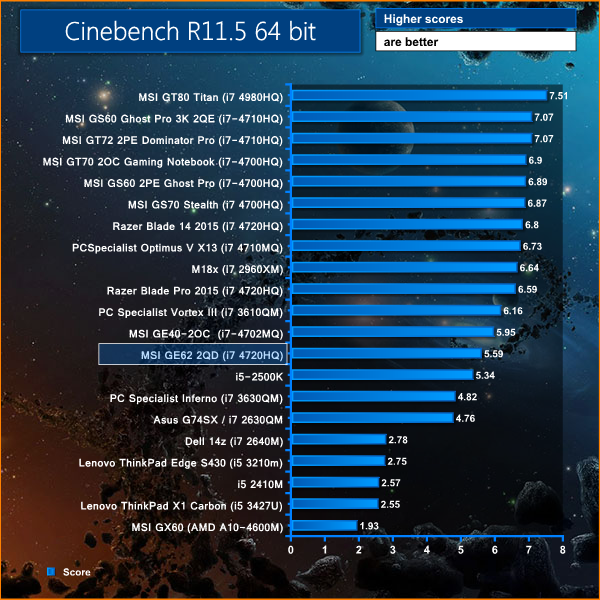 Performance is much as we would expect from the i7 4720HQ. The single channel memory configuration does impact performance a little.