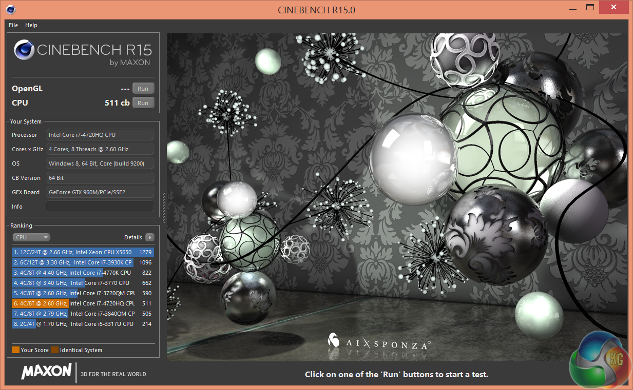 CINEBENCH 15 is a cross-platform testing suite that measures hardware performance and is the de facto standard benchmarking tool for leading companies and trade journals for conducting real-world hardware performance tests. With the new Release 15, systems with up to 256 threads can be tested. CINEBENCH is available for both Windows and OS X and is used by almost all hardware manufacturers and trade journals for comparing CPUs and graphics cards.