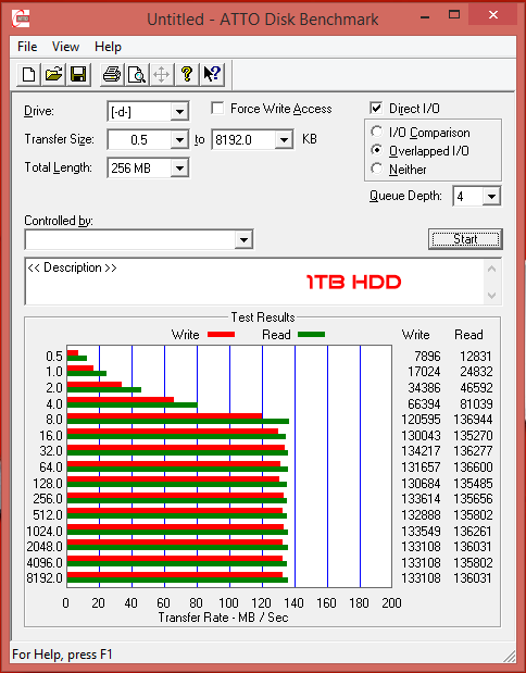 The SSD Raid 0 configuration hits around 1000 MB/s in the read test, and the mechanical hard drive hits a limit around 136 MB/s.