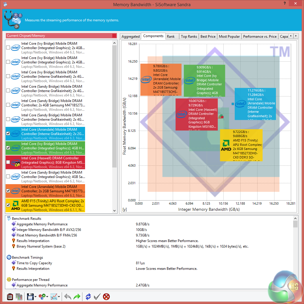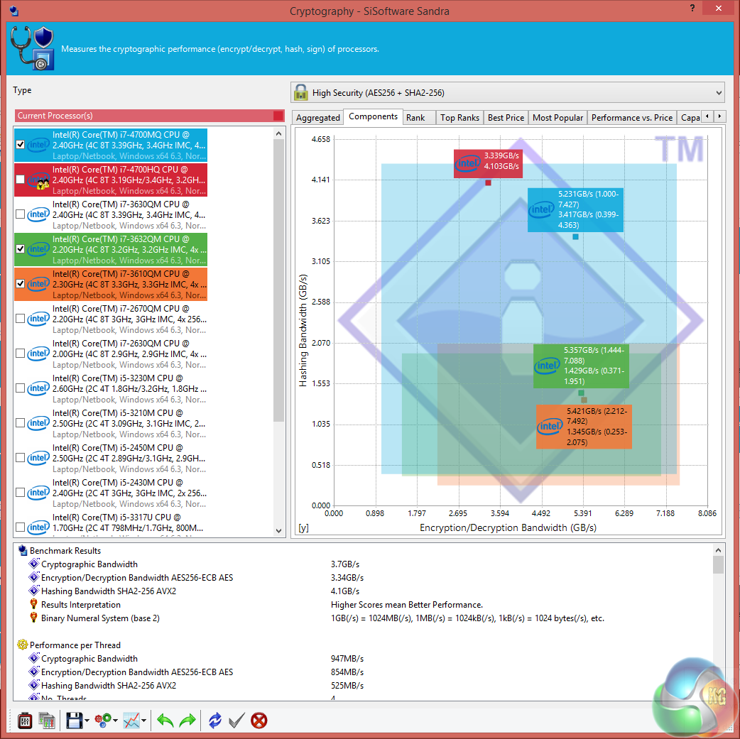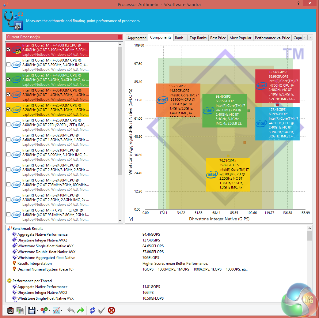 As we mentioned earlier in the review, this laptop is running the memory in single channel, which is the reason for the low scores in the Sandra Memory Bandwidth test. It is unlikely to have much of an impact in our real world tests however, based on previous results. The Core i7 processor performance is excellent, as it should be.