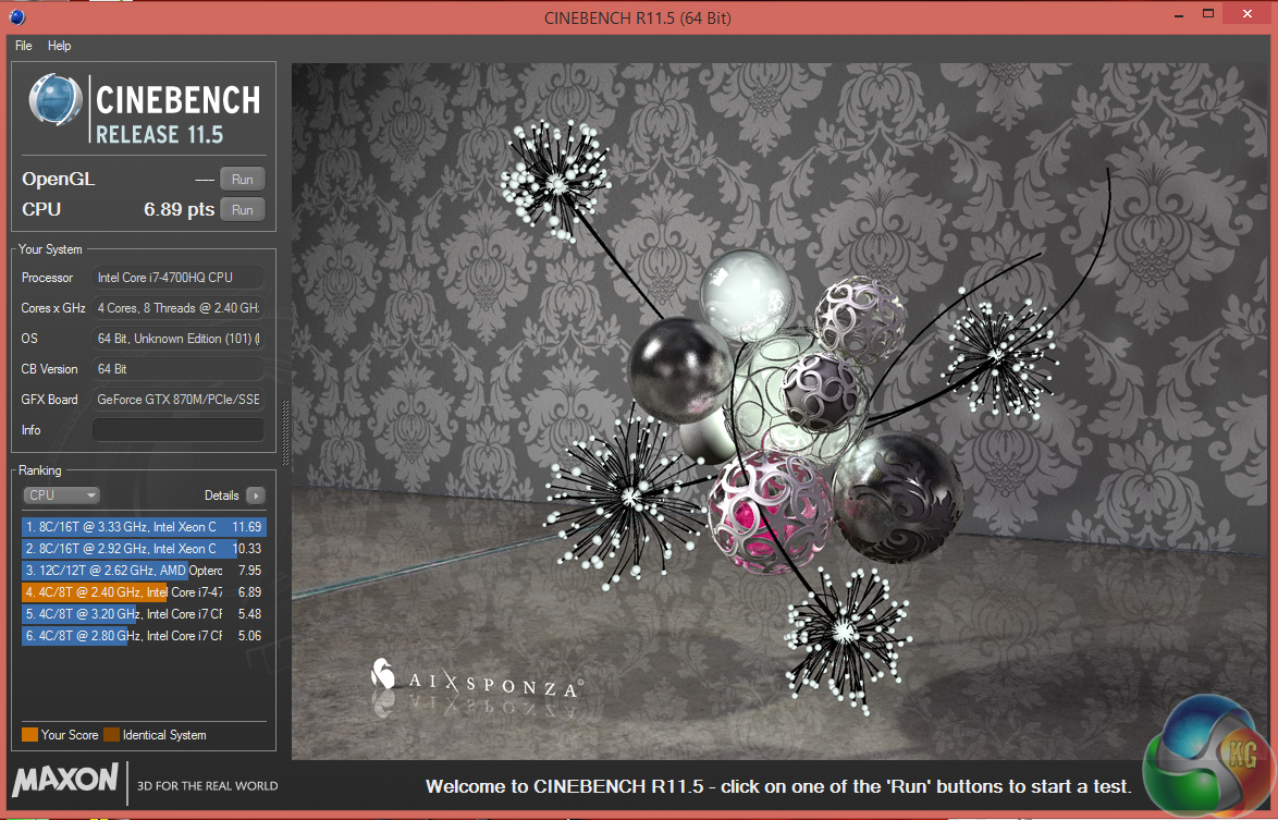 CINEBENCH R11.5 64 Bit is a real-world cross platform test suite that evaluates your computer’s performance capabilities. CINEBENCH is based on MAXON’s award-winning animation software CINEMA 4D, which is used extensively by studios and production houses worldwide for 3D content creation. MAXON software has been used in blockbuster movies such as Spider-Man, Star Wars, The Chronicles of Narnia and many more. CINEBENCH is the perfect tool to compare CPU and graphics performance across various systems and platforms (Windows and Mac OS X). And best of all: It’s completely free.