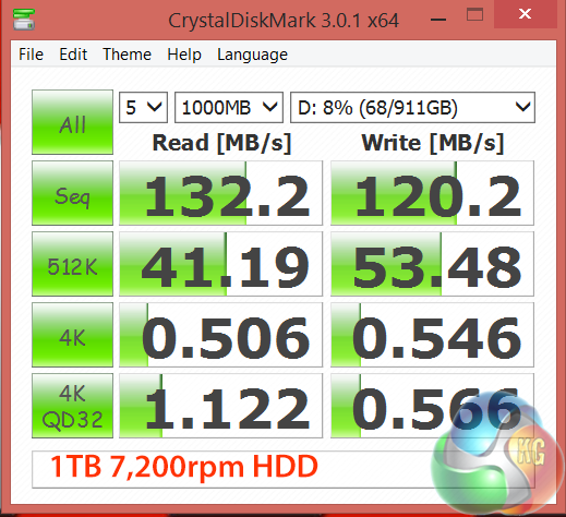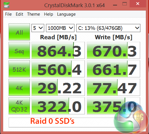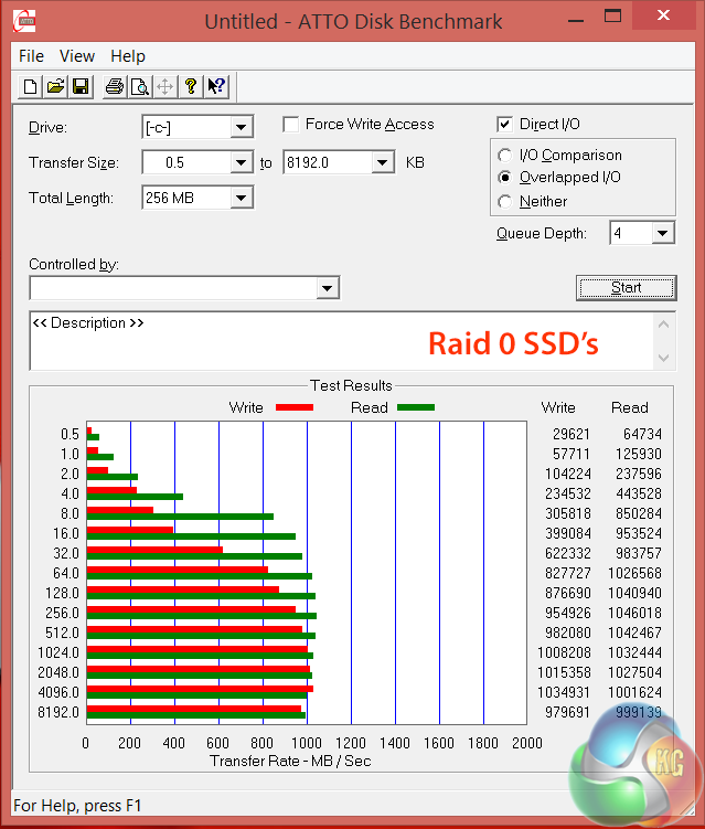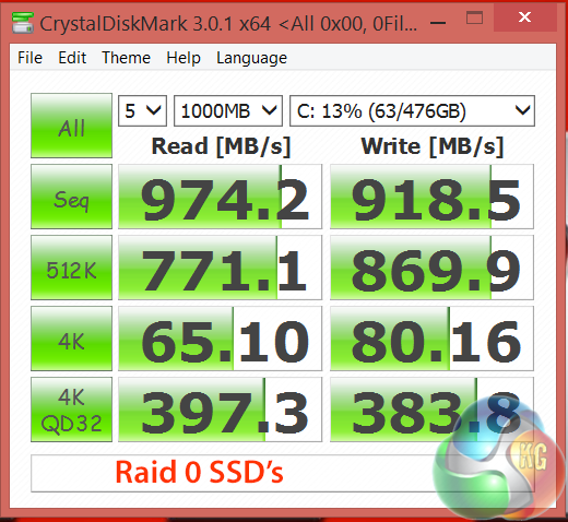 We enabled 0x00 – compressible mode on the Raid 0 SSD, to see how it would affect performance. As we can see performance increased to almost 1GB/s sequential read, and around 920 MB/s sequential write. Superb results.