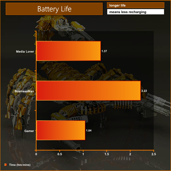 Second as a businessman, with screen brightness around half way. Wireless was enabled. A mixture of checking, answering emails using Microsoft Office and editing pictures in Adobe Photoshop.