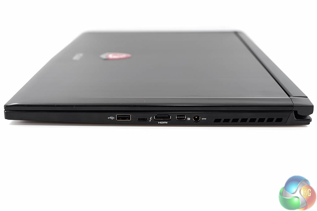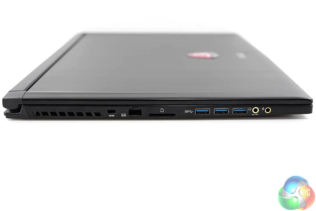 The MSI GS73 6RF ‘Stealth Pro' has three USB 3.0 ports on the left, alongside a card reader, Kensington Lock, GB LAN, and audio and microphone jacks. On the right side we have a USB 2.0 port (ideal for a mouse), a USB 3.1 Gen 2/DisplayPort/Thunderbolt 3 Type-C port, HDMI 2.0 port (4k support @ 60Hz), Mini Displayport (v1.2) and a power connector. Cooling vents are visible on both sides of the chassis.