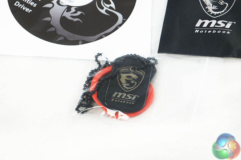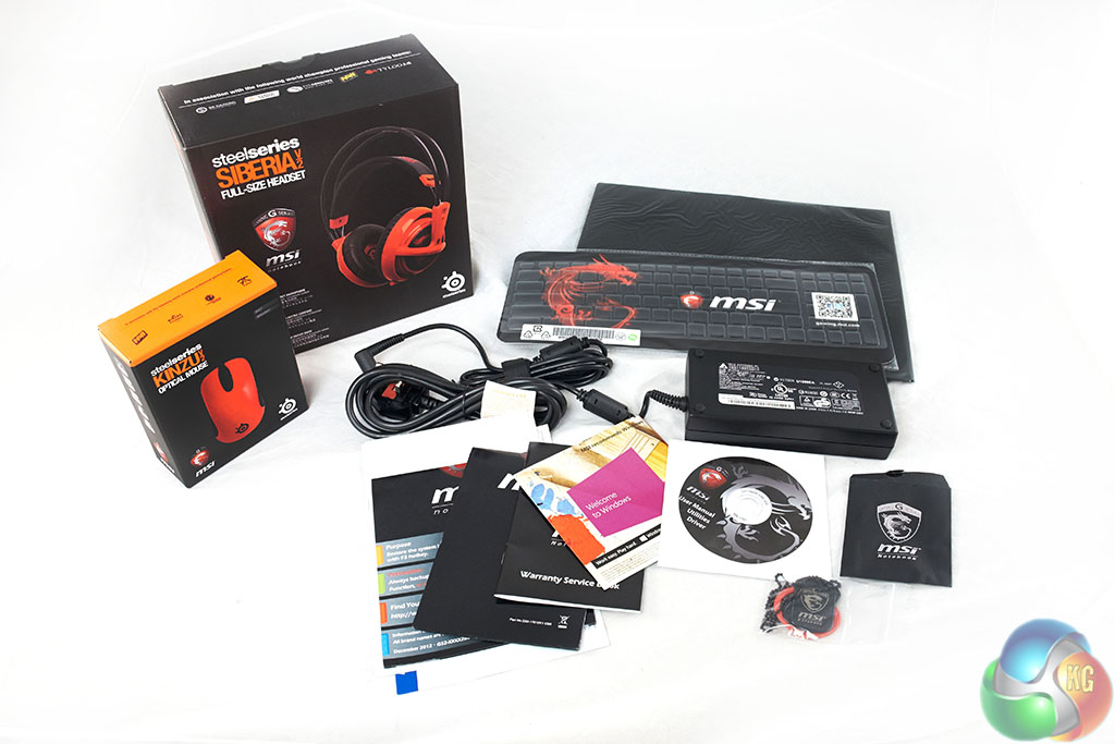You get: an MSI branded Siberia V2 Steelseries headset, Kinzu V2 Steelseries mouse, literature galore, power adapter, CD and driver disc, keyboard and screen cover and MSI branded dog tags!