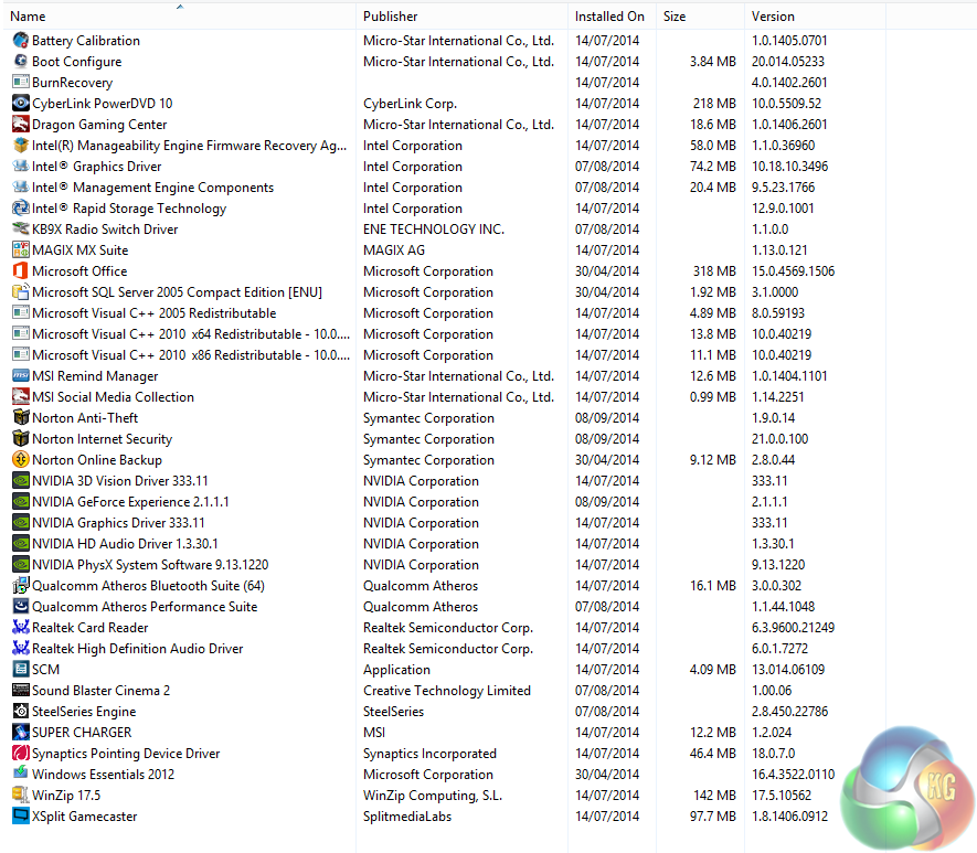 There is a lot of software installed ‘out of the box' although to be fair most of it is relevant to the hardware in the GT72 2PE Dominator Pro. I was however a little disappointed to see Norton software installed – I would prefer the option to install my own anti virus software. I admit I deinstalled this software before running any tests as it kept popping up reminders to register or pay for it. I also consider Norton software to be a resource hog.