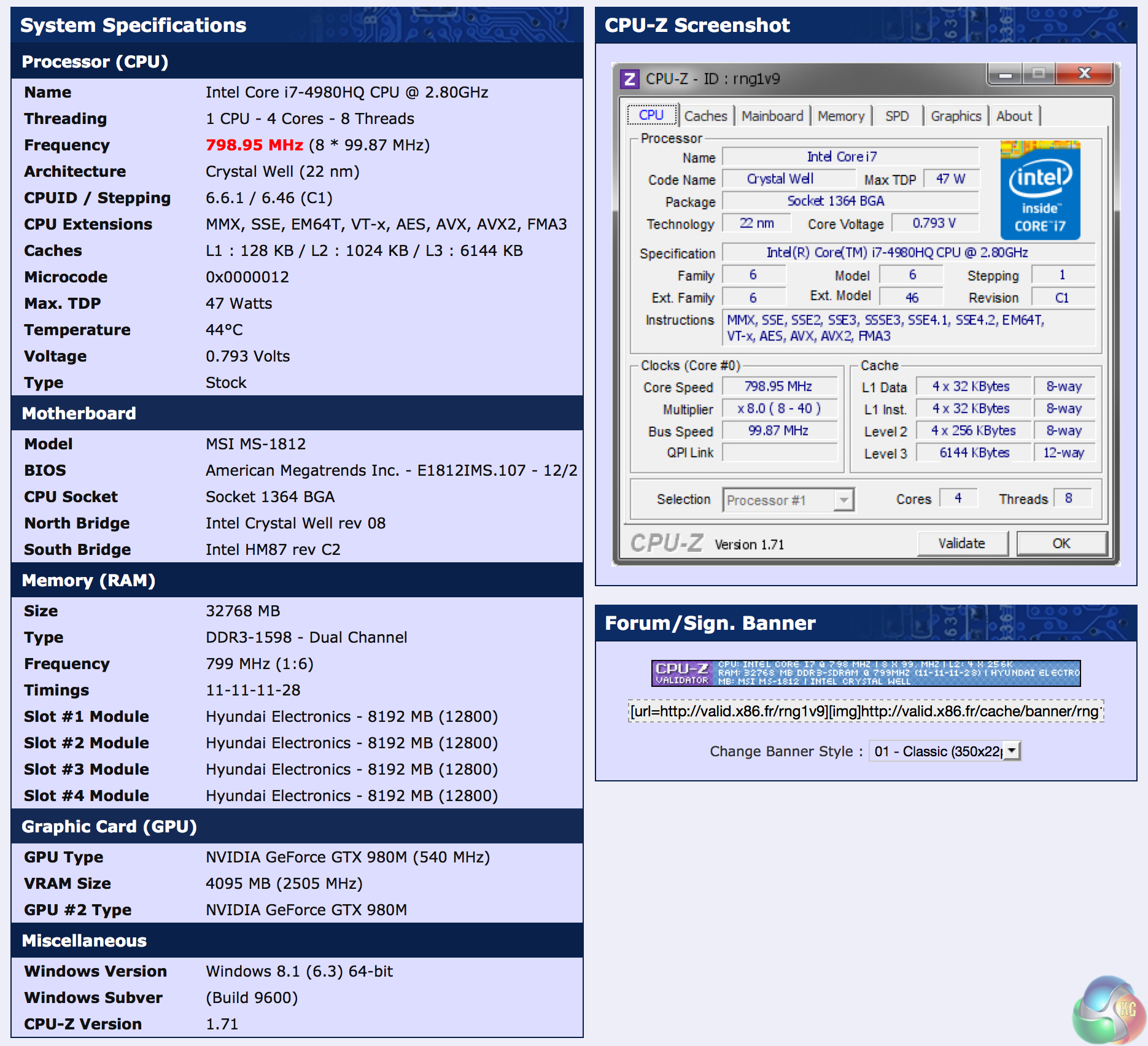 System validation is available over HERE. A breakdown of the hardware inside the MSI GT80 Titan. At the heart of the system is the flagship Intel Core i7 4980HQ which runs at 2.8ghz, with a turbo to 4ghz. 32GB of Hyundai DDR3 memory is installed, running at 1600mhz with 11-11-11-28 timings. This is a dual channel configuration.