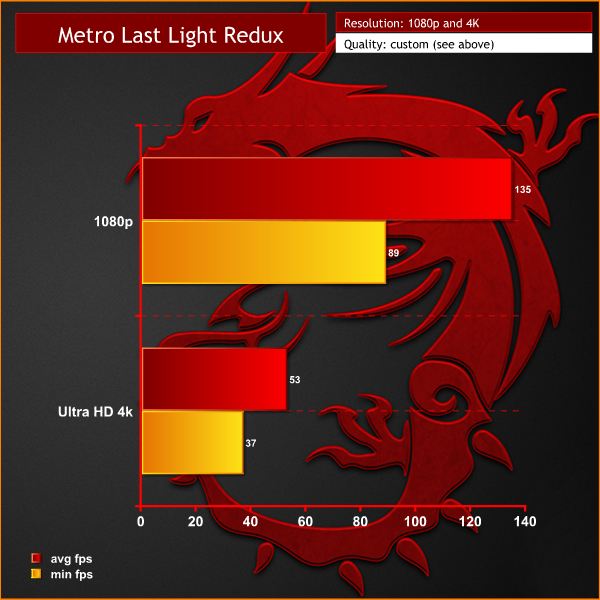 Super smooth frame rates at 1080p, holding close to 100 frames per second most of the time. At Ultra HD 4K, performance drops to an average of 53 frames per second. We would adjust some of the image quality settings to improve minimum frame rates a little.