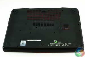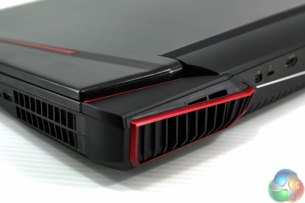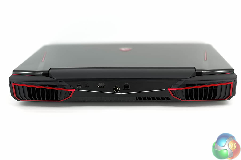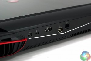 The rear of the laptop features two angular cooling ports, surrounded with a sporty red bezel. There is a Gigabit Ethernet port, alongside the power connector, HDMI out, Superport (Thunderbolt 3 / USB 3.1 in Type-C format) and Mini DisplayPort out.