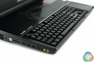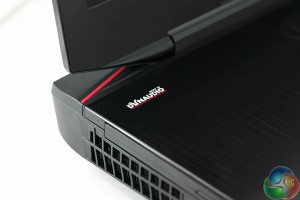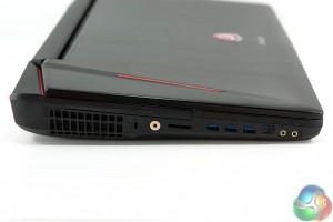 This is no super-slim ultra portable. At the rear of the laptop we measured around 5cm thickness. Huge vents are clearly visible on both left and right sides. On the left side is a bluray player, Kensington lock, a hifi audio connector, memory card reader, three USB 3.0 ports, optical, and microphone and speaker connectors.