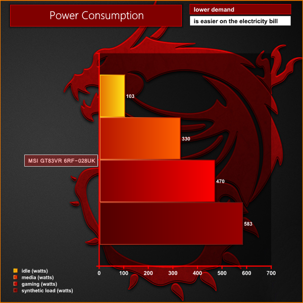 At idle we measured around 100 Watts load. This quickly rises to between 150 and 350 Watts when performing general tasks such as watching high definition video files. When gaming, the power demand rises to between 400 and 500 Watts. Under synthetic forced conditions, we measured power consumption at a whopping 583 Watts.