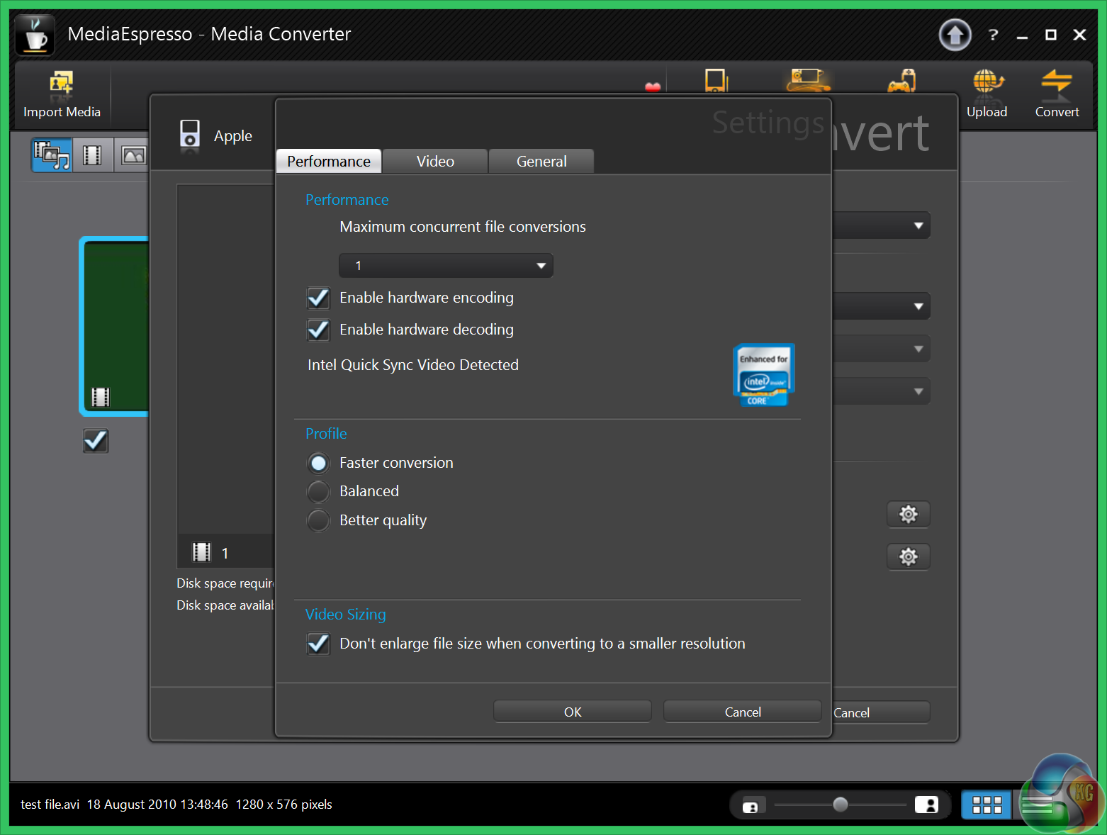 For our testing today we are converting a 3.3GB 720p MKV file (2h:12mins) to Apple Mp4 format for playback on a portable device. This is a common procedure for many people and will give a good indication of system power. We are using the newest version of MediaEspresso.
