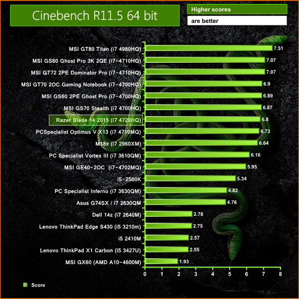 Performance in this benchmark is excellent, although again, a little less than we would expect, I would have expected over 7 points from the 4720HQ. Thermal throttling is a fairly safe bet, even at this early stage.
