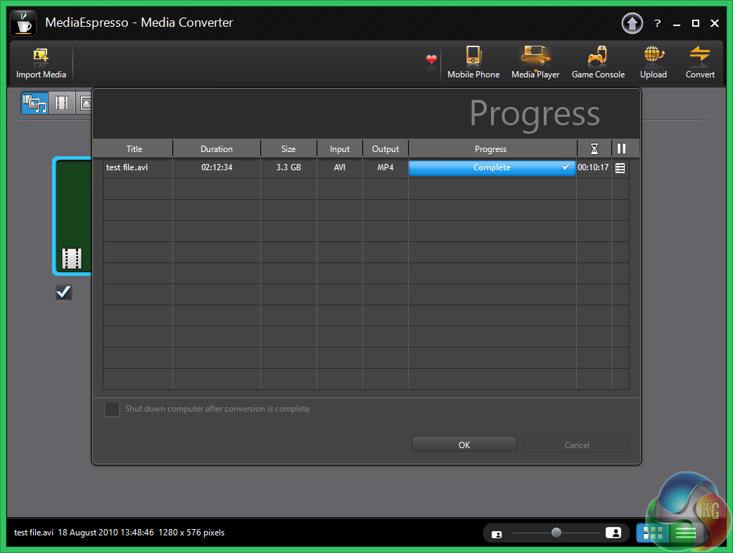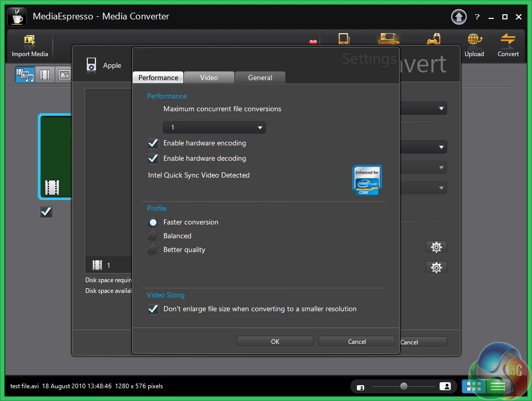 For our testing today we are converting a 3.3GB 720p MKV file (2h:12mins) to Apple Mp4 format for playback on a portable device. This is a common procedure for many people and will give a good indication of system power. We are using the newest version of MediaEspresso.