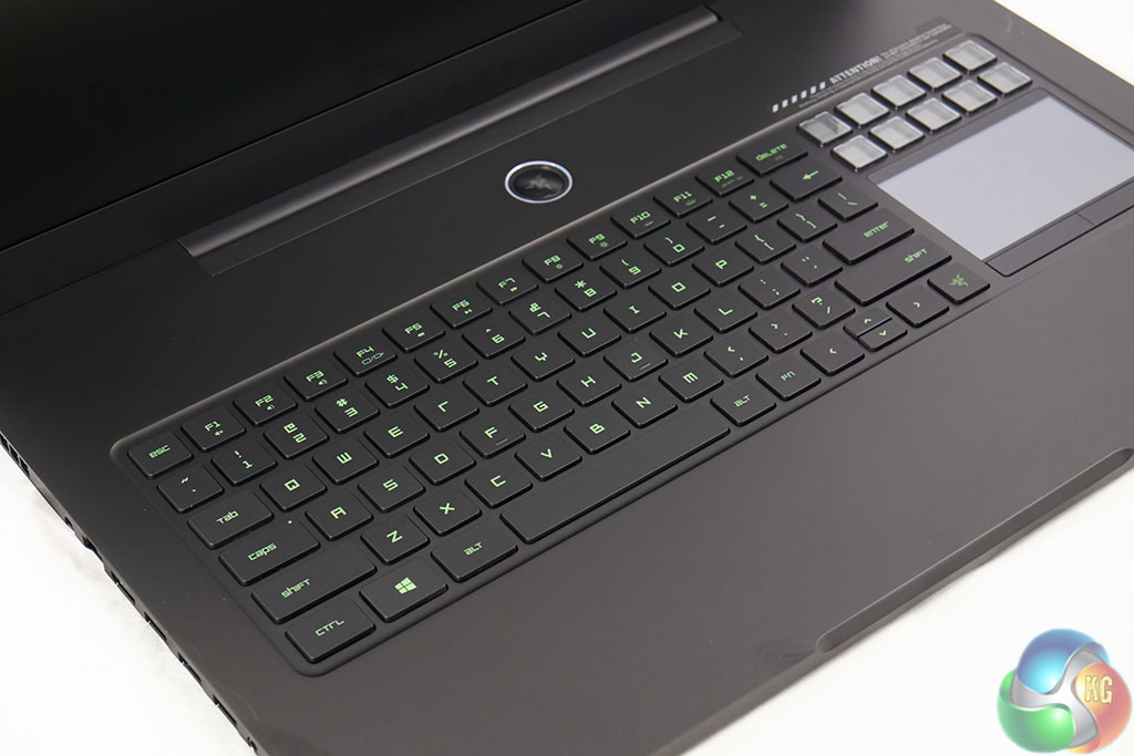 The power button is stunning, oversized, and pulses green when the machine is turned on. We like how the keys have green accenting, so even when the backlighting is off, the colour scheme is clear to see. The word ‘BLADE' is engraved into the chassis, between the power button and the panel. A speaker grill runs along the top of the laptop in front of the heavy duty hinge.