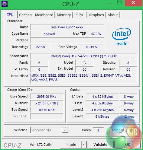 An overview of the system in GPUz and GPUz. The Intel Quad Core i7 4720HQ is a very capable quad core processor, with hyperthreading. It is clocked at 2.6ghz, with a turbo boost up to 3.6ghz. More details HERE.