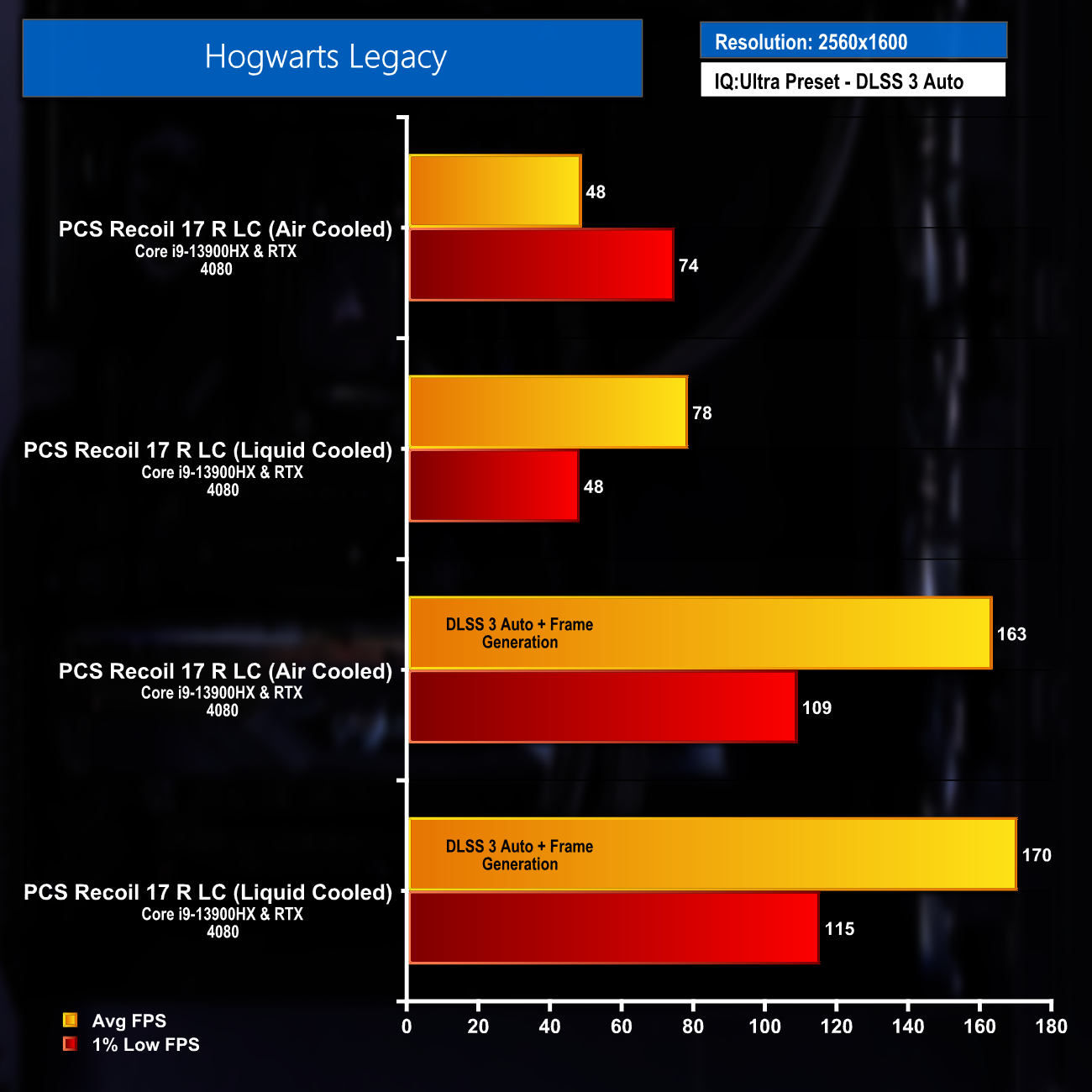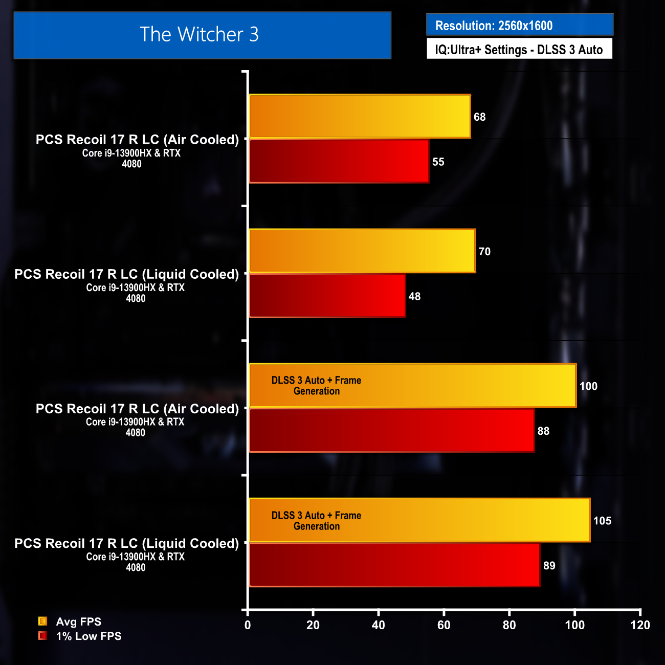 Gaming on the 2560×1600 display was a great experience during the review. The results below (at maximum settings) show that the pairing of the Intel Core-i9 13900HX and Nvidia RTX 4080 can easily deliver smooth frame rates in most titles, with DLSS 3 and frame generation helping to push this even further in supported games.