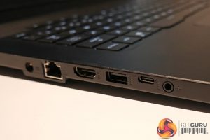 Rounding out our look at the chassis, it is good to see a relatively healthy set of connectivity options. The right-hand side of the machine boasts 2x USB 3.1 Gen1 Type A, while the left-hand side offers Ethernet, HDMI, 1x USB 3.1 Gen1 Type A, 1x USB 3.1 Gen 2 TypeC and a 3.5mm jack. Interestingly, that TypeC port is also capable of charging the laptop up to 100W. It won't be able to deliver enough juice for a full-on gaming session, but if you're just browsing the web in a coffee shop, there's no need to lug the included power brick around with you.