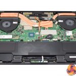 Internally, things look pretty standard with the large battery taking up most of the laptop's bottom half, while the cooling system consists of two blower fans and two copper heatpipes, which as we shall see below seems to get the job done despite not appearing to be overly sophisticated.