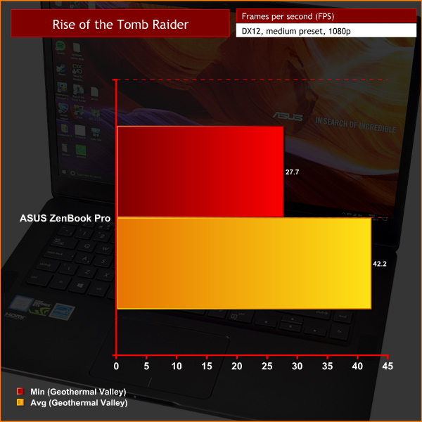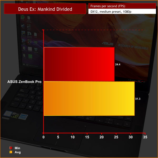 The ZenBook Pro isn't really a gaming machine – the GTX 1050 would probably be better for accelerating any workflows rather than being used with the latest AAA titles, as even at medium settings the machine struggles.