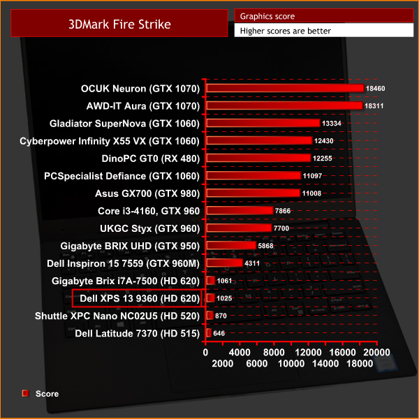 Far from a great score, it is clear the XPS 13 is not meant for gaming – even the relatively weak GTX 960M scores well ahead of the integrated graphics.