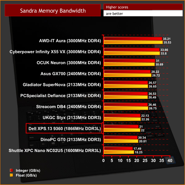 To test the memory bandwidth of the 8GB DDR3L RAM that comes with the XPS 13, I ran SiSoft Sandra's memory bandwidth benchmark.