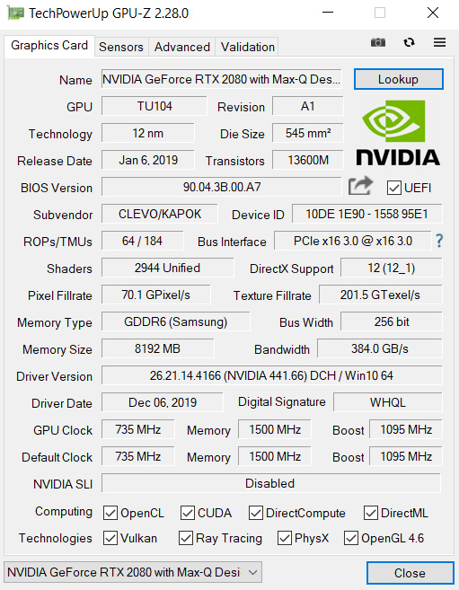 • GPU: NVIDIA GeForce RTX 2080 8GB with Max-Q Design