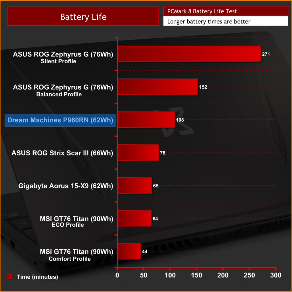Despite that level of hardware in the P960RN, battery life is surprisingly decent. OK, it's not going to last you all day – or even three hours away from the wall – but compared to many other machines we've tested, the total runtime of 1hr48 is a comparatively good result. Then again, as with any gaming laptop, you will need to use the power brick for gaming and other demanding tasks.