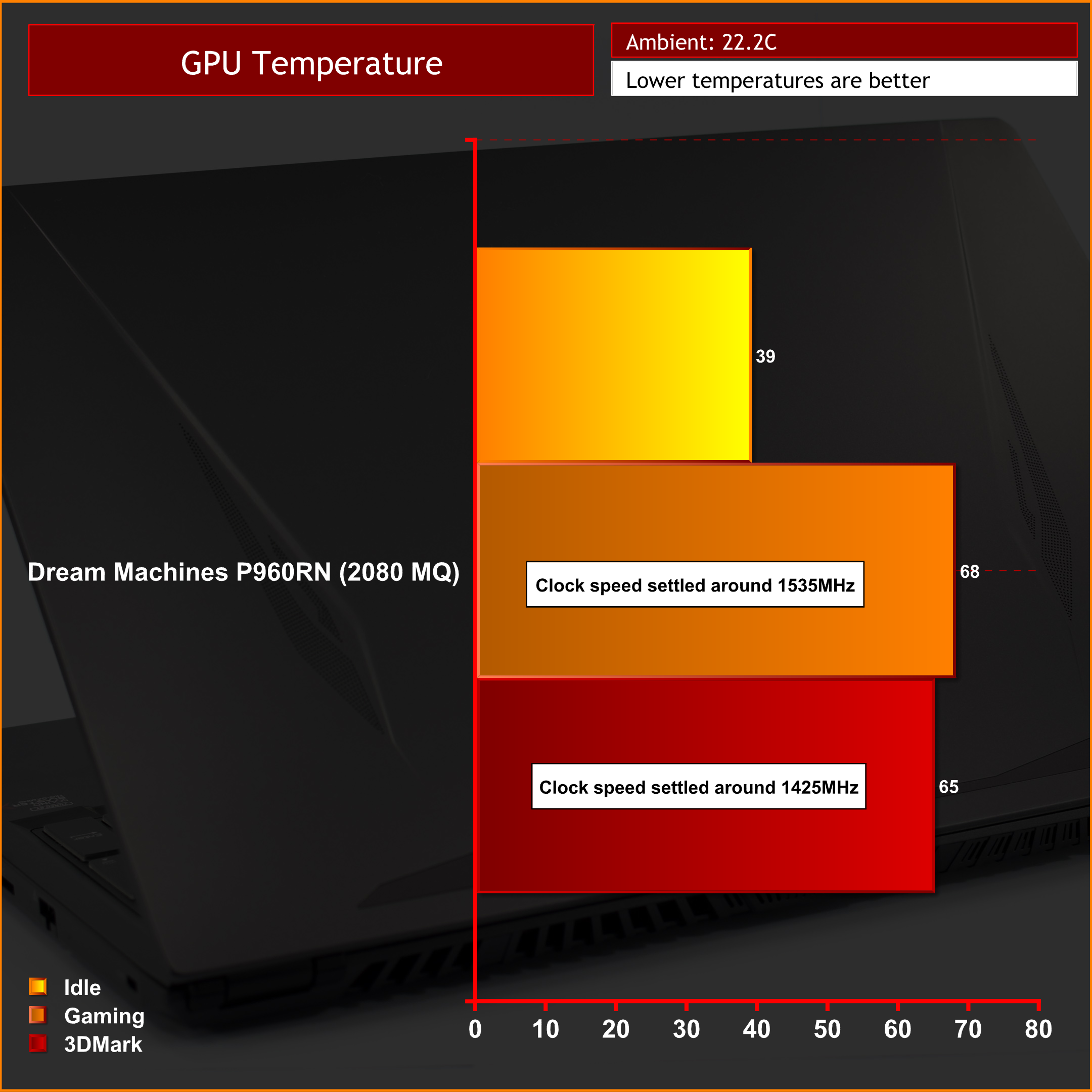 As for the GPU now, I did not see the 2080 Max-Q run any hotter than 68C, either while gaming or when stressed in 3DMark Fire Strike Ultra for 30 minutes. Gaming frequency typically settled around 1535MHz, which is much higher than the rated boost clock of 1095MHz, and is fast enough to provide very healthy frame rates as we saw on the previous page.