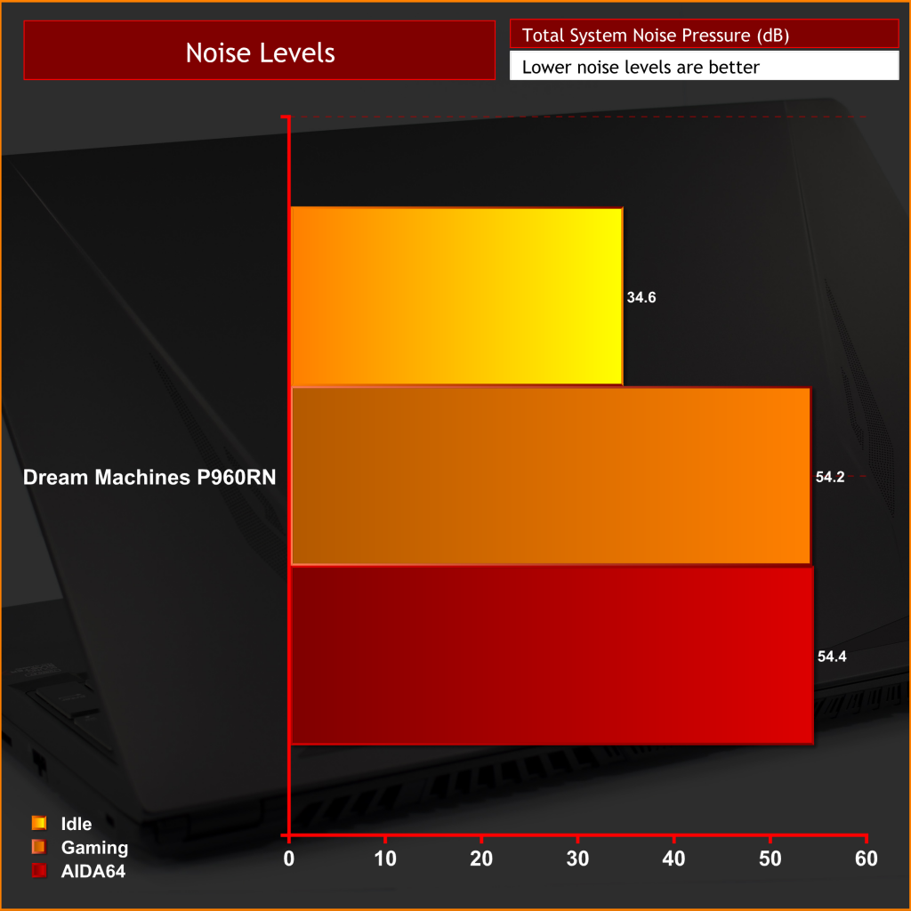 The fans certainly do have to spin up quite fast to keep thermals in check, but that said overall noise from the P960RN is definitely not the loudest I've heard from a laptop. You will want to use a headset while gaming, and others in the room are likely to find it annoying, but that is generally par for the course with a slim machine packing this level of hardware.