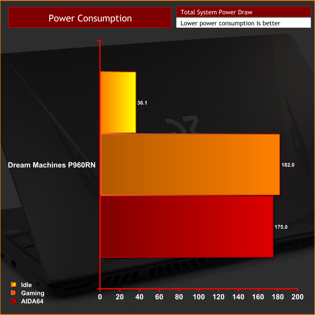 Finally, power consumption comes in right at the 180W rating of the power brick. In fact, our meter did show wattage just creeping over by a couple of watts on occasion while gaming. Still, with the CPU drawing 45-50W under load, and the GPU pulling 90W (based on HWINFO software monitoring), that leaves 40W for the rest of the system and certainly I didn't see anything to suggest a bigger power brick would improve overall performance.
