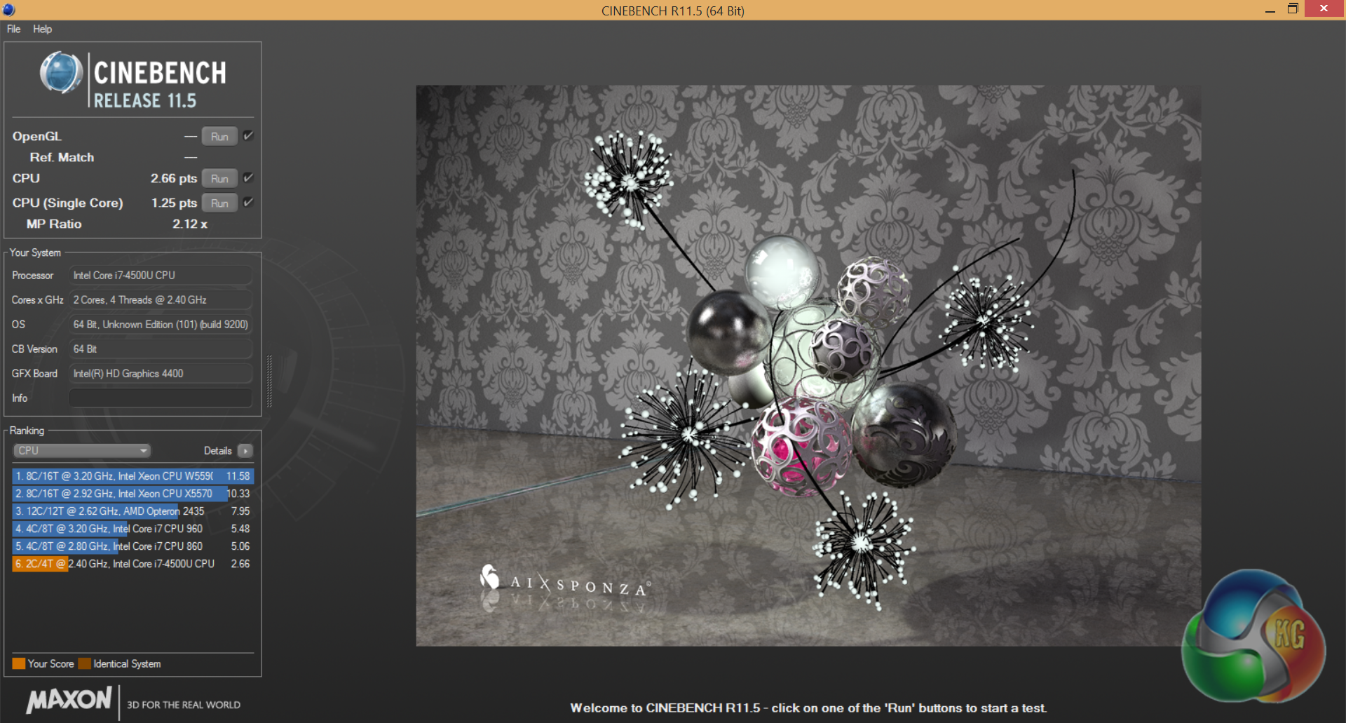 Cinebench R11.5 is the second newest revision of the popular benchmark from Maxon. The test scenario uses all of your system’s processing power to render a photorealistic 3D scene (from the viral “No Keyframes” animation by AixSponza). This scene makes use of various different algorithms to stress all available processor cores.