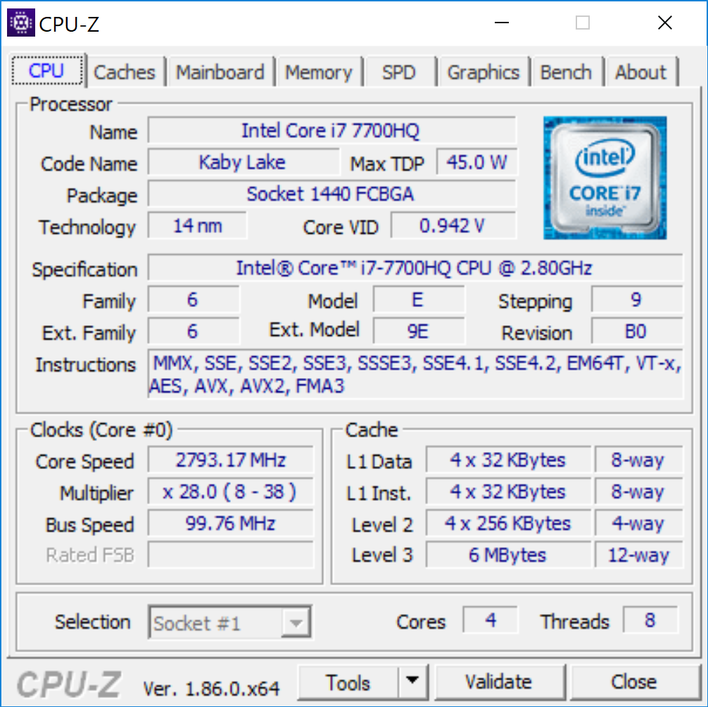 The 7700HQ is at the bottom of the high power Intel Core i7 mobile range from Intel's eighth Kaby Lake generation. It has been around for over a year, but currently there is no direct high power successor available. This is a quad-core CPU with Hyper-Threading, and runs at a nominal 2.8GHz. However, a single core can run at 3.8GHz, two cores at 3.6GHz, and all four at 3.4GHz.