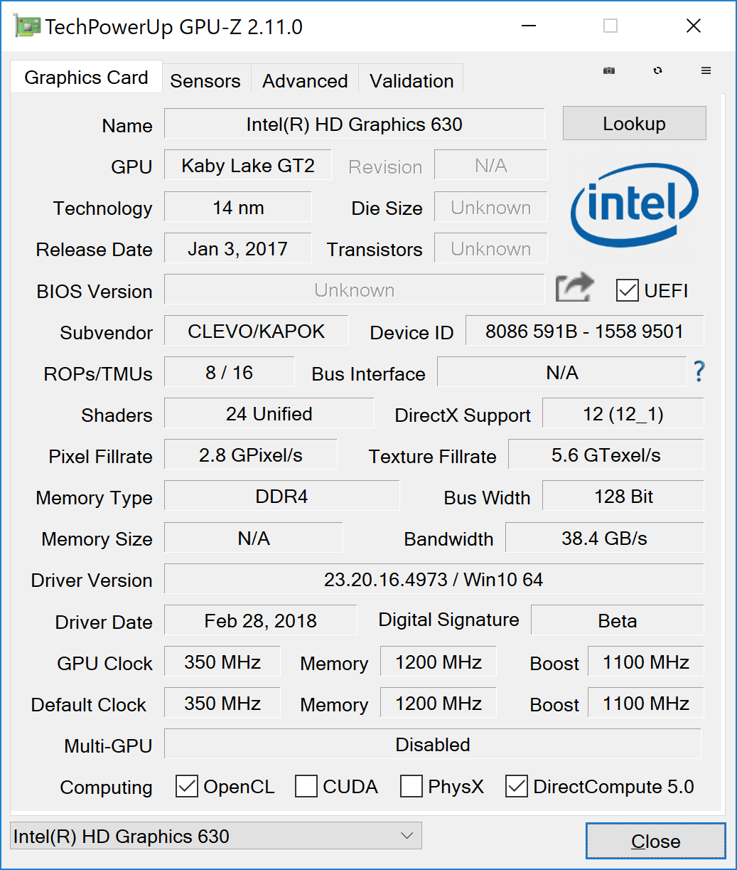 However, the Intel processor also has UMA graphics built in. This is HD 630, which operates at 350MHz with a 1,100MHz boost, and boasts 192 shading units. You won't want to use this for professional 3D work; it's more there for when you're using this laptop on the move for everyday tasks like email or Web browsing.